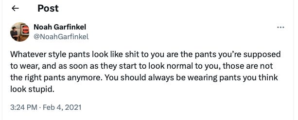That’s all for now– if you have any pants-related observations, lmk. Otherwise, I hope you’re well and I hope you have some pants you love