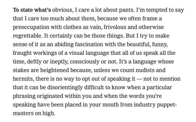 Weiner goes on to talk about the evolution of style as conversation, especially in this age where there is a whole category of content focused on watching people Get Ready. Clothes as language is easy to dismiss as frivolous because I sometimes equate caring about style as privilege– which it also can be– and is often relegated to those that can spend. But we all wear pants– or skirts or dresses or shorts, etc. What should I wear is a universal decision and therefore worthy of deep analysis.